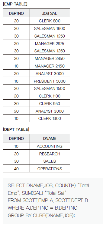 DEPTNO로 조인을 하고 DNAME과 JOB으로 CUBE를 실행했다. CUBE는 전체합계와 각 칼럼별로 부분합계를 출력한다.