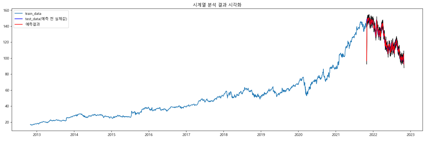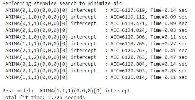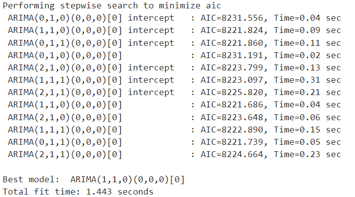 (방법 - 2)auto_arima 함수 - auto_arima 함수 사용 : p, d, q 값을 모두 추출해 준다. - y = 데이터 원본 - d = 차분의 차수, 이를 지정하지 않으면 실행 시간이 매우 길어짐(기본값 None) - start_p(기본값 2), max_p(기본값 5) : AR(p)를 찾기 위함 범위(start_p에서 max_p까지 수행) - start_q(기본값 2), max_q(기본값 5) : AR(q)를 찾기 위함 범위(start_q에서 max_q까지 수행) - m : 계절적 특성이 있을 때 사용하는 매개변수(기본값 1) > 차수를 의미함 - seasonal : 계절성 특성이 있을 때 사용(기본값 True) : 계절성 특성이 있을 때 (True) > m의 값은 계절적 특성의 범위 차수 지정(보통 3) : 계절성 특성이 없을 때 (False) > m은 1을 보통 사용 - stepwise : 최적의 모수를 찾기 위한 알고리즘을 사용할지 여부 (최적의 모수 찾기 알고리즘 : 힌드만-칸다카르 알고리즘이 적용됨) - trace : 결과 출력 여부(기본값 False)