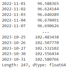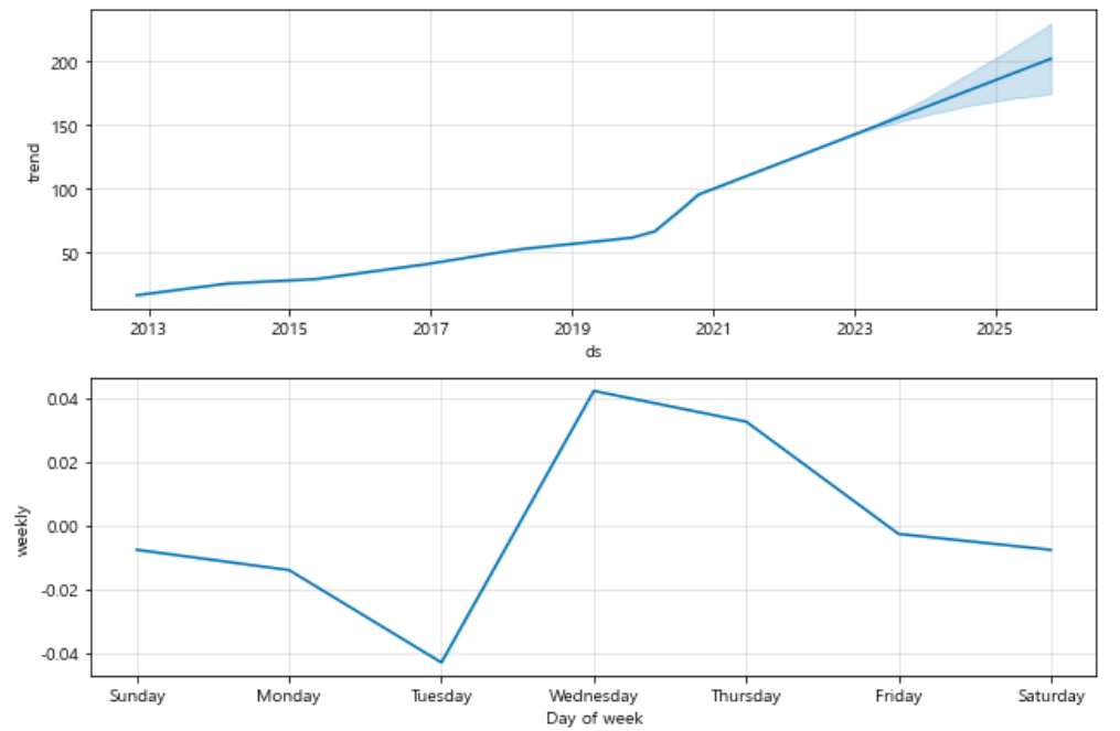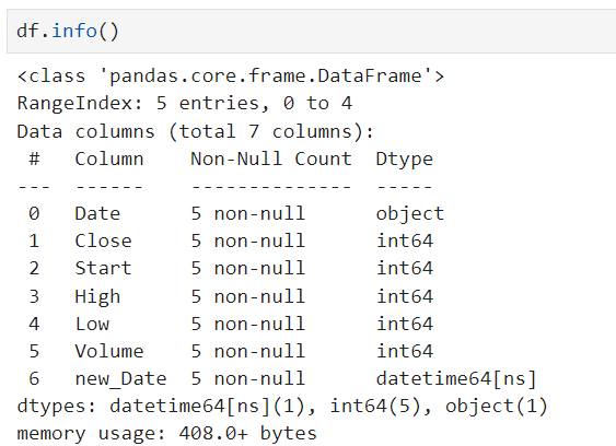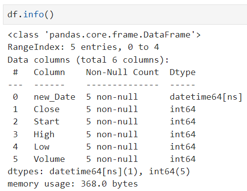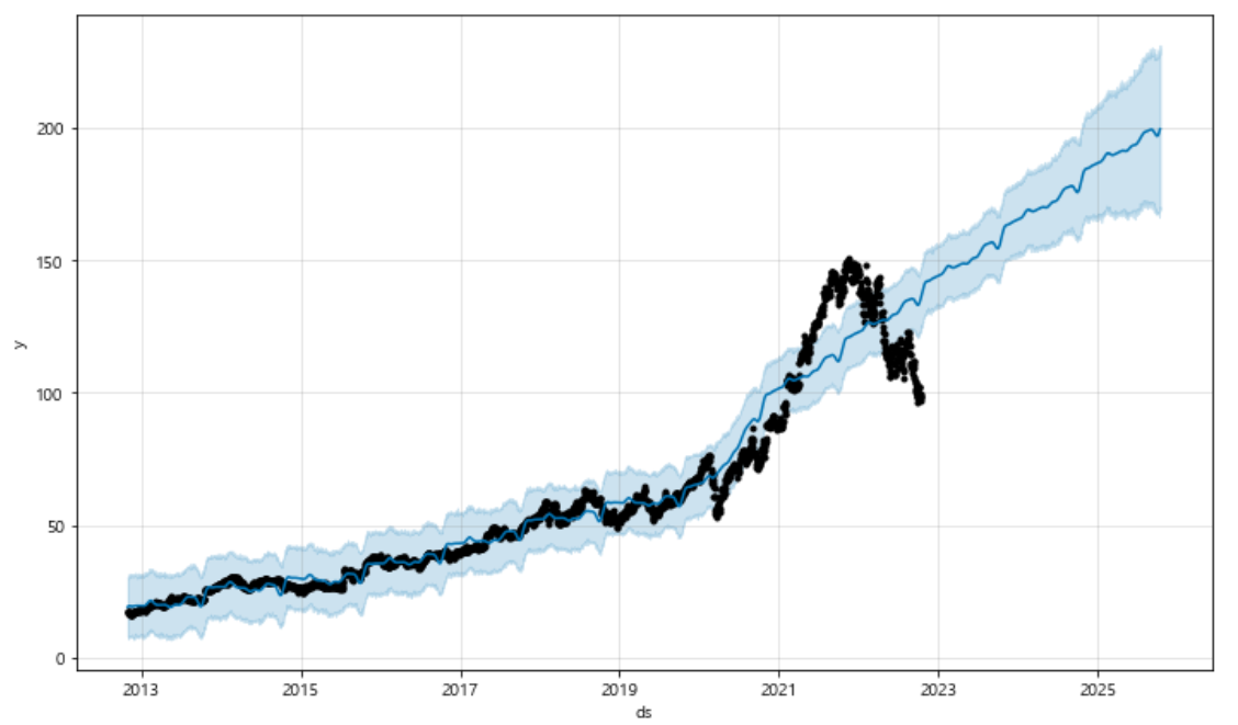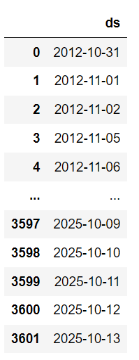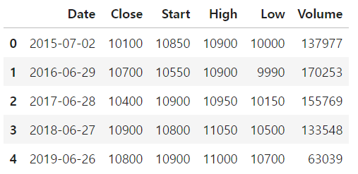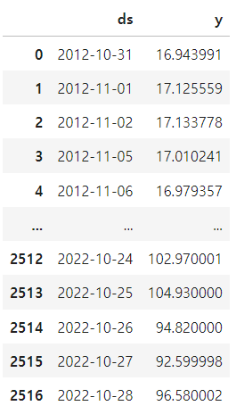📍 시계열 예측을 그래프(시각화)로 표현하는 모델 📍 Prophet 모델에 넣어줘야 하는 데이터 형태 - index는 날짜, Data컬럼, Adj Close(수정종가) 컬럼 - Prophet에서 사용하는 컬럼명은 ds, y 컬럼명을 사용함 > 기존 컬럼명을 수정해야함 > Data 컬럼명은 ds로, Adj Close 컬럼명은 y로 수정