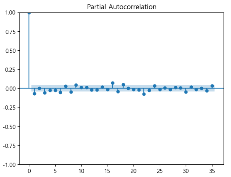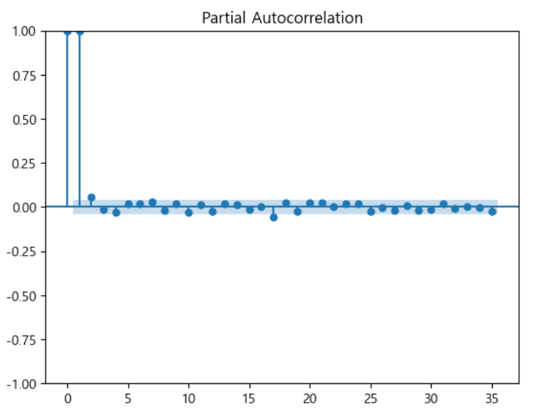 < PACF plot > - 첫값을 제외한 1개 이후 파란 박스에 들어가면서, 막대 그래프가 끊기는 것으로 보임 - 이는 자기회귀모형(AR)의 결과값이 1개 이후인, 즉 p는 1인 값을 활용하는 것이 적절하다는 의미임 - 이동평균(MA)의 값은 AR과의 차이값이 0이 되도록 하는 것이 일반적임 - 따라서, MA는 1이 적절함을 의미함