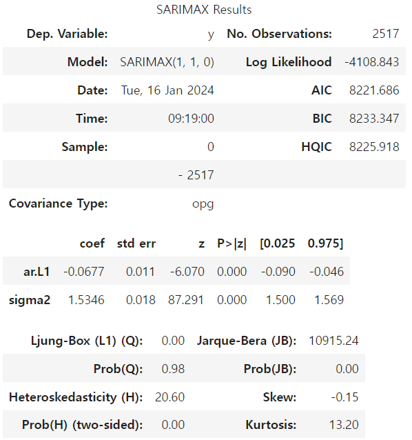 📍 결론 - AR(p) = 1, d = 1, MA(q) = 1이 적절 - 이때, MA(q)값은 AR - MA값을 사용하기도 한다. (q=0) - MA값은 AR - MA를 사용