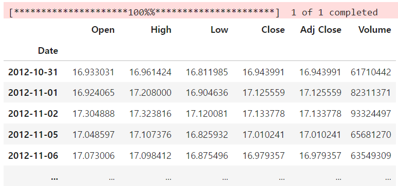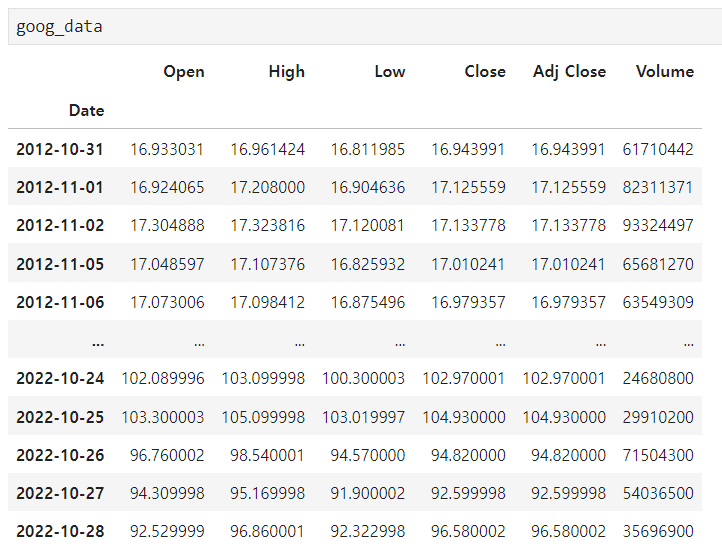 📍 증권사 : yahoo finance 📍 수집 증권 : 구글 주식(GOOG) 수집 📍 수집 기간 : 2012년 10월 31일부터 2022년 10월 31일까지 데이터 📍 증권사 제공 라이브러리 : yfinance 라이브러리를 제공하고 있음 📍 라이브러리 설치 필요 pip install yfinance