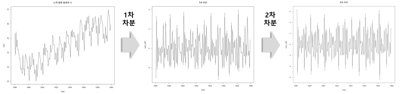 차분 설명 이미지 - 차분을 할수록 정상성을 띄게 됨 - 그러나 너무 많은 차분은 오히려 비정상성을 띄게 할 수 있음 - 적절한 차수를 찾아서 차분을 진행해야 함(= 하이퍼파라미터 조정)