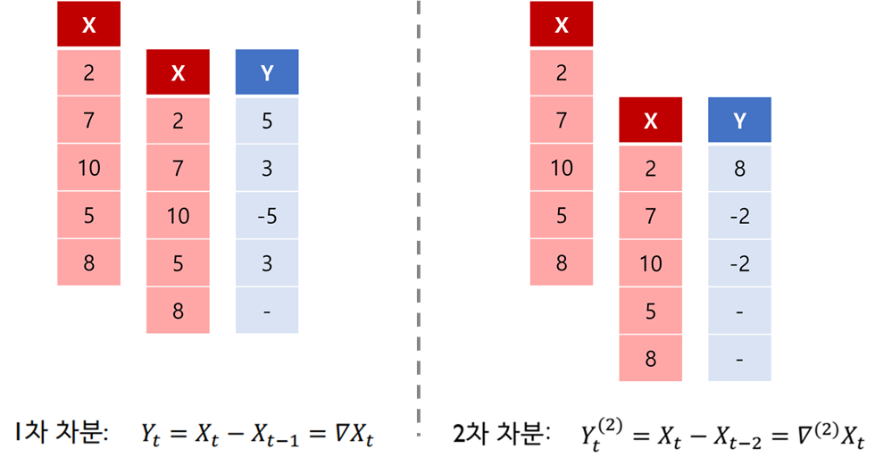 * 차분 : 비정상성을 정상성으로 만들기 위해 관측값들의 차이를 계산하여 사용하게 됨