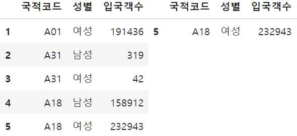 - 데이터 행/열이 많은 경우 -> 기본 상위 5개, 하위 5개를 추출해서 보여줌