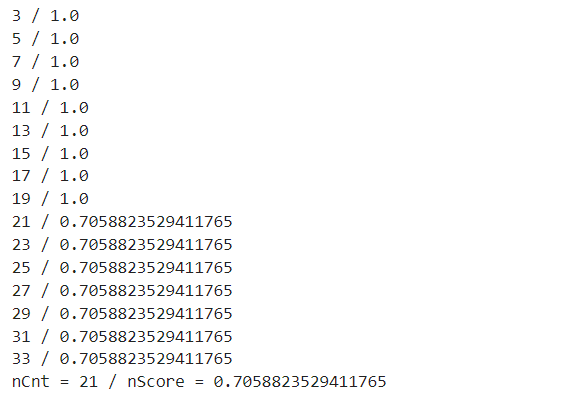 print(f"nCnt = {nCnt} / nScore = {nScore}")
