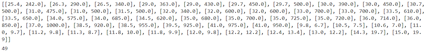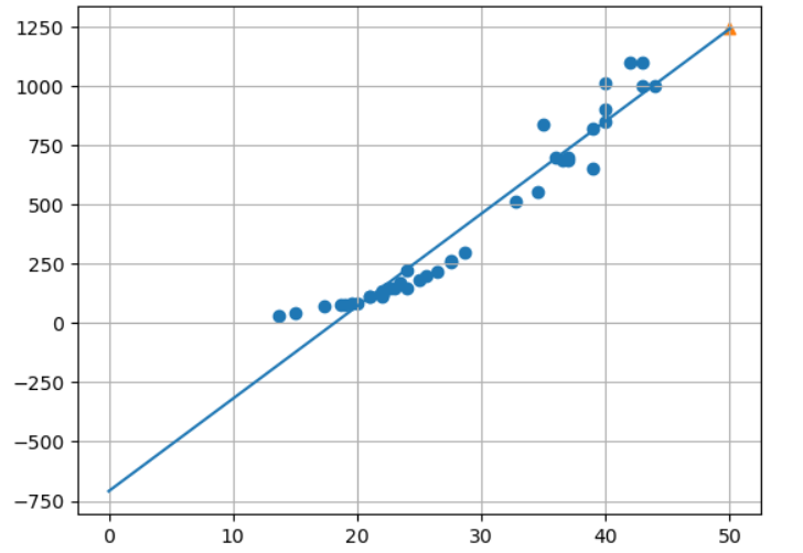 - 임의 값 예측 시 KNN보다는 성능이 좋은 예측이 가능하며, 과적합이 발생하지 않는 일반화된 모델로 보여지나, y절편의 값이 음수로 예측시 음수의 데이터가 예측 될 가능성이 있는 모델로 보여짐 - 종속변수 무게의 값은 0이하로 나올 수 없기에 이상치를 예측할 수 있는 모델로 현재 사용하는 데이터를 예측하기에는 부적합한 모델로 여겨짐