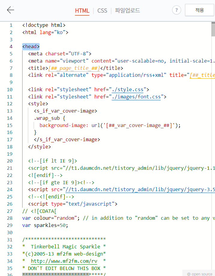 코드를 살펴보면 <head>태그가 있는데 <head> </head>사이에 복사한 코드를 그대로 붙여 넣으면 된다.