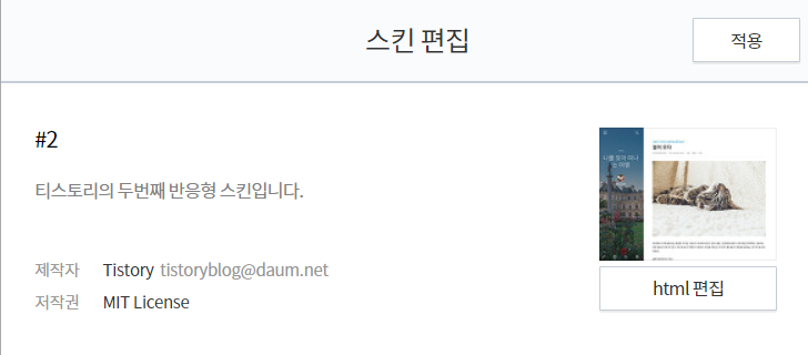 들어가면 오른쪽 상단 스킨 편집에 html 편집이 있는데 이곳에서 나의 Tistory html 코드를 작성 할 수 있는 곳이 있다.