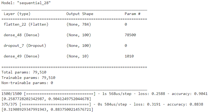''' Dropout(0.3) : 사용되는 특성 30% 정도를 제외하기 ''' dropout_layer = keras.layers.Dropout(0.3) model = model_fn(dropout_layer) model.summary()
