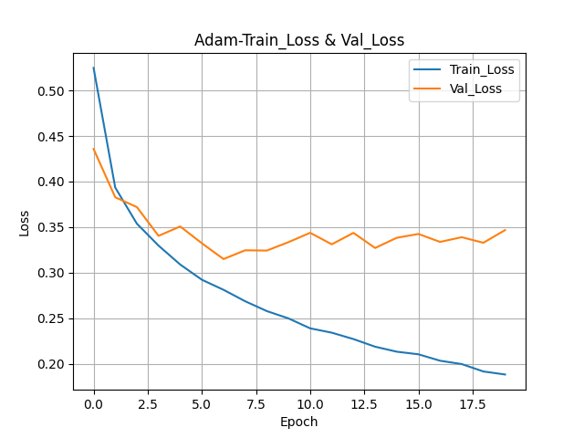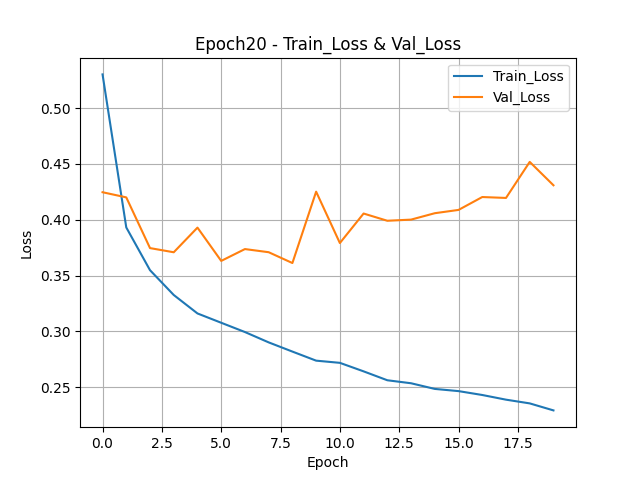 ''' - 훈련과 검증에 대한 손실(loss) 곡선 그리기 ''' # 훈련 손실률 그래프 plt.plot(history.epoch, history.history["loss"]) # 검증 손실률 그래프 plt.plot(history.epoch, history.history["val_loss"]) plt.xlabel("Epoch") plt.ylabel("Loss") plt.grid() # 범례 추가 plt.legend(['Train_Loss', 'Val_Loss']) # 제목 설정 plt.title("Epoch20 - Train_Loss & Val_Loss") # 그래프 저장 plt.savefig("./saveFig/Train-Loss-Val-Loss.png") plt.show()