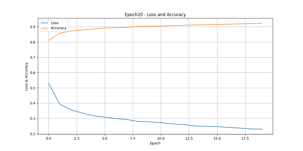 plt.figure(figsize=(12, 6)) # 손실률 그래프 plt.plot(history20.epoch, history20.history["loss"]) # 정확도 그래프 plt.plot(history20.epoch, history20.history["accuracy"]) plt.xlabel("Epoch") plt.ylabel("Loss & Accuracy") plt.grid() # 범례 추가 plt.legend(['Loss', 'Accuracy']) # 제목 설정 plt.title("Epoch20 - Loss and Accuracy") # 그래프 저장 plt.savefig("./saveFig/Epoch20-Loss-Accuracy.png") plt.show()