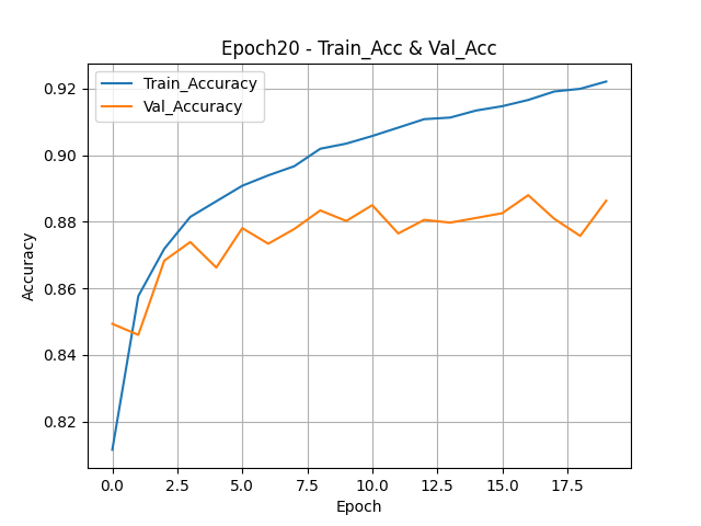 ''' - 훈련과 검증에 대한 정확도(accuracy) 곡선 그리기 ''' # 훈련 정확도 그래프 plt.plot(history.epoch, history.history["accuracy"]) # 검증 정확도 그래프 plt.plot(history.epoch, history.history["val_accuracy"]) plt.xlabel("Epoch") plt.ylabel("Accuracy") plt.grid() # 범례 추가 plt.legend(['Train_Accuracy', 'Val_Accuracy']) # 제목 설정 plt.title("Epoch20 - Train_Acc & Val_Acc") # 그래프 저장 plt.savefig("./saveFig/Train-Acc-Val-Acc.png") plt.show()