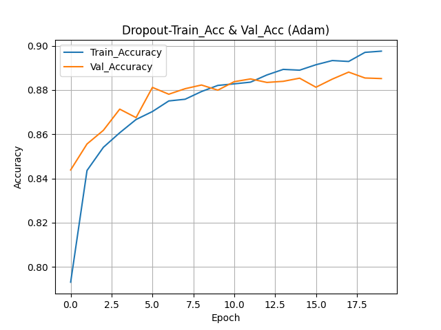 # 훈련 정확도 그래프 plt.plot(history.epoch, history.history["accuracy"]) # 검증 정확도 그래프 plt.plot(history.epoch, history.history["val_accuracy"]) plt.xlabel("Epoch") plt.ylabel("Accuracy") plt.grid() # 범례 추가 plt.legend(['Train_Accuracy', 'Val_Accuracy']) # 제목 설정 plt.title("Adam-Train_Acc & Val_Acc") # 그래프 저장 plt.savefig("./saveFig/Adam-Train-Acc-Val-Acc.png") plt.show()