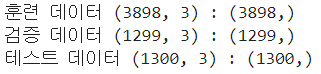 X_train, X_temp, y_train, y_temp = train_test_split(X_scaled, y, test_size=0.4, random_state=42) X_val, X_test, y_val, y_test = train_test_split(X_temp, y_temp, test_size=0.5, random_state=42) print(f"훈련 데이터 {X_train.shape} : {y_train.shape}") print(f"검증 데이터 {X_val.shape} : {y_val.shape}") print(f"테스트 데이터 {X_test.shape} : {y_test.shape}")