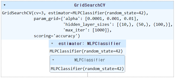 grid_search_mlp = GridSearchCV(mlp_model, param_grid, cv=3, scoring="accuracy") grid_search_mlp