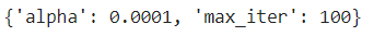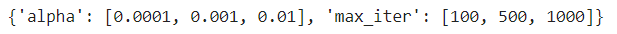 param_grid = { ### 학습률 : 보폭 "alpha" : [0.0001, 0.001, 0.01], ### 반복 횟수(epoch) "max_iter" : [100, 500, 1000] } param_grid