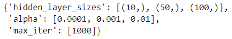 param_grid = { ### hidden_layer_sizes : 은닉계층 정의 # - (10,) : 은닉계층 1개 사용, 출력크기 10개를 의미함 # - (10, 10) : 은닉계층 2개 사용, 각각의 출력 크기가 10개라는 의미 # - (10, 11, 12) : 은닉계층 3개 사용, 각각의 출력 크기는 10, 11, 12 "hidden_layer_sizes" : [(10,), (50,), (100,)], "alpha" : [0.0001, 0.001, 0.01], "max_iter" : [1000] } param_grid