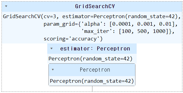 grid_search = GridSearchCV(perceptron_model, param_grid, cv=3, scoring="accuracy") grid_search