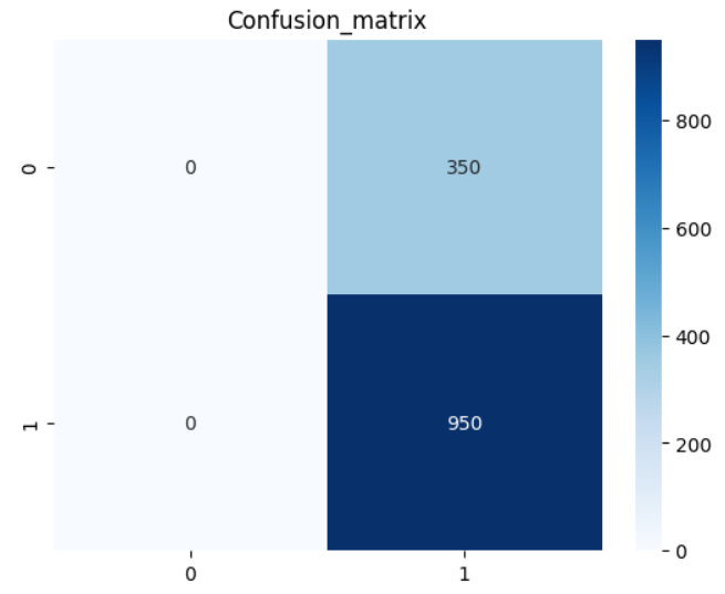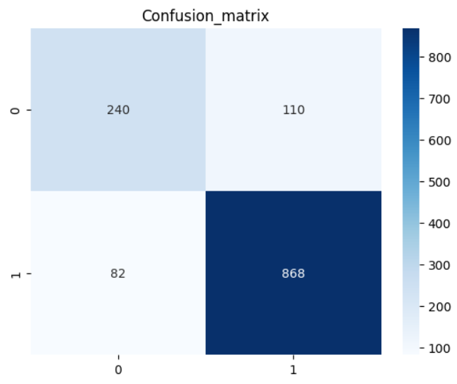 plt.title("Confusion_matrix") sns.heatmap(cm, annot=True, fmt="d", cmap="Blues", xticklabels=["0", "1"], yticklabels=["0", "1"]) ### cbar=False 설정시 오른쪽 막대 바 사라짐 plt.show()