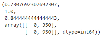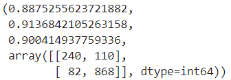 ''' 예측하기 ''' y_pred = best_model_mlp.predict(X_test) ''' 정밀도 ''' pre = precision_score(y_test, y_pred) ''' 재현율 ''' re = recall_score(y_test, y_pred) ''' f1-score ''' f1 = f1_score(y_test, y_pred) ''' 평가 매트릭스(혼동행렬) ''' cm = confusion_matrix(y_test, y_pred) pre, re, f1, cm