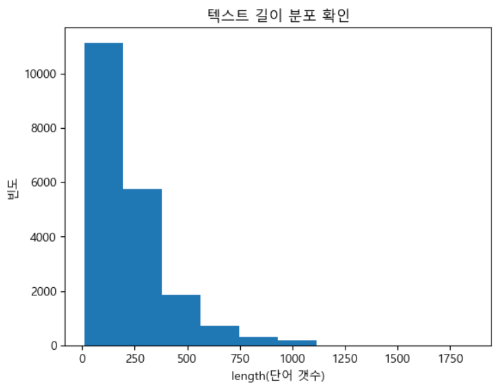 단어 갯수의 분포를 이용해서 훈련에 사용할 독립변수 각 값들의 길이 기준 정의 전체적으로 왼쪽편에 집중되어 있으며, x축 125 정도에 많은 빈도를 나타내고 있음 따라서, 독립변수 각 값들의 길이를 100으로 통일(정규화)