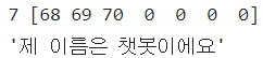''' 질문/답변 테스트''' user_input = "너 이름이 뭐니?" ''' 새로운 질문 텍스트를 단어사전의 인덱스번호로 변환하기 ''' input_seq = tokenizer.texts_to_sequences([user_input]) input_seq ''' 단어의 길이를 훈련에서 사용한 길이로 통일시키기 (정규화) ''' padded_seq = pad_sequences(input_seq, padding="post", maxlen=questions_padded.shape[1]) padded_seq ''' 예측하기 : 새로운 질문에 대한 답변 추출하기 ''' pred = model.predict(padded_seq) len(pred[0][1]) '''' 답변으로 가장 확률이 높은 값 추출하기 ''' pred_index = tf.argmax(pred, axis=-1).numpy()[0] print(len(pred_index), pred_index) ''' 시퀀스에 해당하는 텍스트 추출하기 - 인덱스에 해당하는 실제 텍스트 추출하기 ''' response = tokenizer.sequences_to_texts([pred_index])[0] response