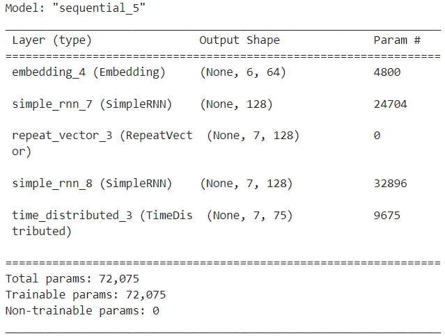 ''' <모델 생성하기> ''' model = tf.keras.Sequential() ''' <계층 추가하기> - 단어 임베딩(입력계층) : 출력 64 - Simple Rnn 사용 : 출력 128, 활성화함수 : RelU ''' model.add(tf.keras.layers.Embedding(vocab_size, 64, input_length=questions_padded.shape[1])) model.add(tf.keras.layers.SimpleRNN(128, activation="relu")) ''' 입력을 복제하는 전처리 계층 : 텍스트에 대한 Encoder와 Decoder를 담당함 ''' model.add(tf.keras.layers.RepeatVector(answers_padded.shape[1])) model.add(tf.keras.layers.SimpleRNN(128, activation="relu", return_sequences=True)) ''' - 각 타임별로 동일한 가중치를 적용하도록 처리하며, 전체 시퀀스들의 이전/다음 인덱트 처리 값을 가지고 있다고 보면 됨 - 예측에 주로 사용되는 계층 - 최종 출력 계층을 감싸고 있음 ''' model.add(tf.keras.layers.TimeDistributed(tf.keras.layers.Dense(vocab_size, activation="softmax"))) model.summary()