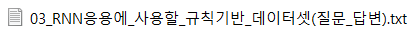 - "03_RNN응용에_사용할_규칙기반_데이터셋(질문_답변)" txt파일 사용